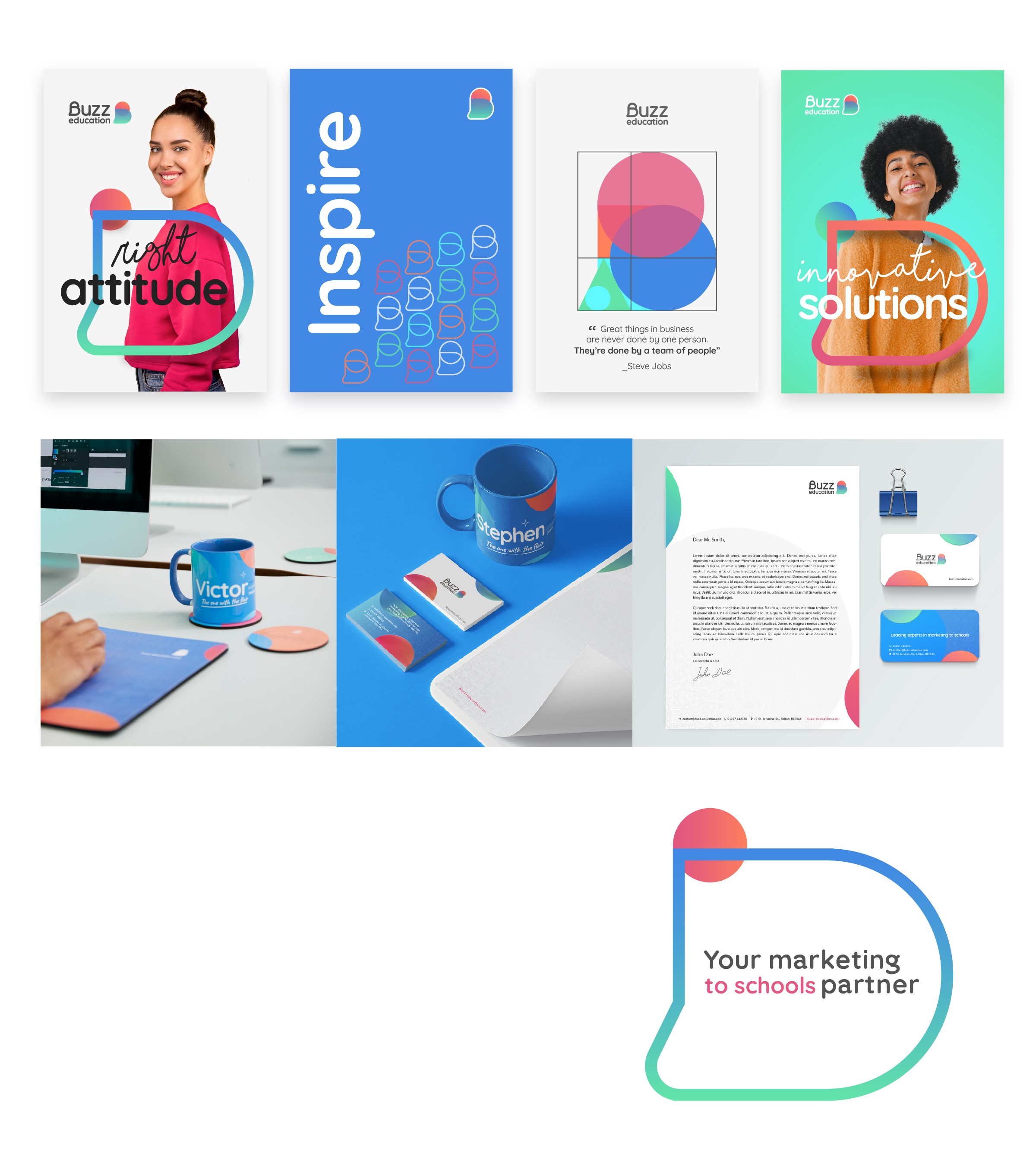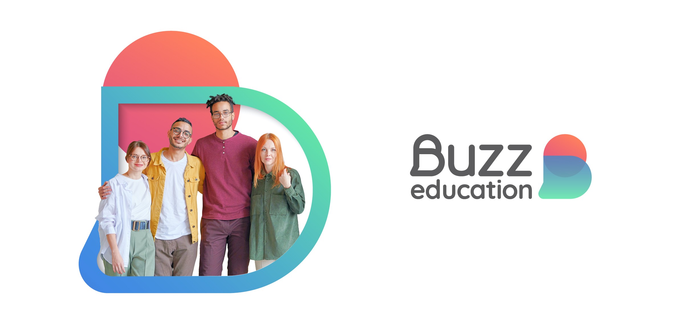 Geometrically designed, the Buzz logo features a bright, vivid and modern colour palette that evokes friendship, people and education with technology.